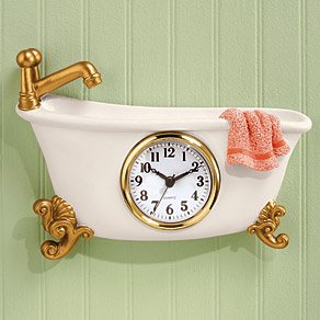 Adorable clawfoot tub adds a splash of style to any bathroom, adding the convenience of an easy-to-read clock. Wonderfully detailed in polyresin, it features golden faucet and feet ... even a fluffy peach towel draped over the side. Uses one AA battery (not included). Features keyhole for hanging. 10" long x 7" high x 1 1/2" deep.