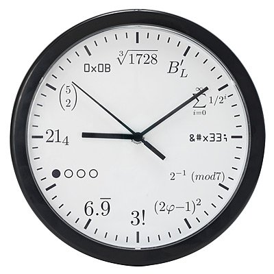 While everyone else was watching the clock, you were paying attention during math class, storing away square roots and factorials for a day where you could prove your mathematical prowess. Well, my geeky friend, that day has come. Pictured before you is a clock, where all the numerals have been replaced by the equivalent notation! How will we ever know what time it is unless you solve them all? Cheat Sheet (included with each clock): 12 - a radical 1 - Legendre's constant is a mathematical constant occurring in a formula conjectured by Adrien-Marie Legendre to capture the asymptotic behavior of the prime-counting function. Its value is now known to be exactly 1. 2 - A joke in the math world: An infinite number of mathematicians walk into a bar. The first one orders a beer. The second orders half a beer. The third, a quarter of a beer. The bartender says, "You're all idiots," and pours two beers.3 - A unicode character XML "numeric character reference." 4 - Modular arithmetic, also know