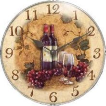 This wall clock has a thin silver frame. The face of the clock has two wine bottles, two glasses and grapes. The hours are marked with Arabic numbers. The hands are metal and have the traditional tear drop shape. This clock has a convex lens.