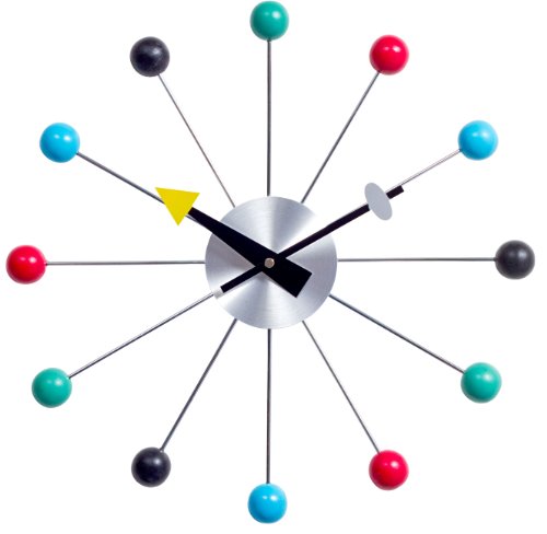 Conceived in 1948, the Ball clock is a ceaseless symbol of modernity brought to a world in flux. With its orbit of twelve multi-colored wooden balls, the work unites time while expressing each movement as a singular point in reality. Perhaps there is no modern classic clock as famous as this. This item is a high quality reproduction of the original. Product Dimensions: 15"L x 15"W x 2"H