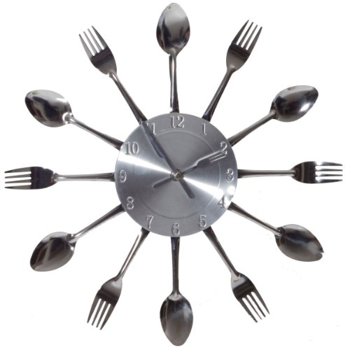 Capture the moment in bite-sized portions with this retro modern commentary on consumption. Interspersed silver-toned shimmering forks and spoons feed the senses with periodic servings of light while a sleek clock face apportions the measurements. Bring culinary expressionism to your kitchen in an eccentric exhibition of contemporary decor. This item is a high quality reproduction of the original. Product Dimensions: 15"L x 15"W x 2"H