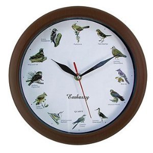 Singing bird clock sings every hour on the hour. Soothes you every hour with melodic bird chirping. Features 12 of the most popular North American bird songs. Each hour is announced by that bird's beautiful song. Hourly chime is pre-set from 6AM to 9PM and silent from 10PM to 5AM.
