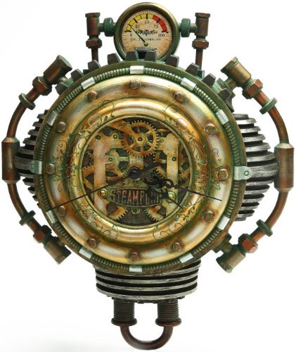 Steampunk Wall Clock Size: 10" H The Steampunk Wall Clock stems from the Colonel J Fizziwigs Steampunk Collection. The face of the clock shows all the gears on the inside. There are no numbers featured on the face, but there are nuts where the numbers would be. This wall clock has an hour, minute, and second hand. The Steampunk Wall Clock is made of hand painted cold cast resin and measures 10 inches tall. Colonel J. Fizziwigs Steampunk Collection