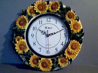 You are bidding on this Sunflower 3-Dimensional -surrouded Wall Clock. This is a very beautiful piece and would brighten up and add a lot of elegance to ANY wall! The Quartz Clock itself is surrounded by many Sunflowers of real-looking and life-size design. Each Sunflower seems to be unique as they all seem to be different in size and shape. There is a great amount of detail on the flowers and stems. It is very beautiful.