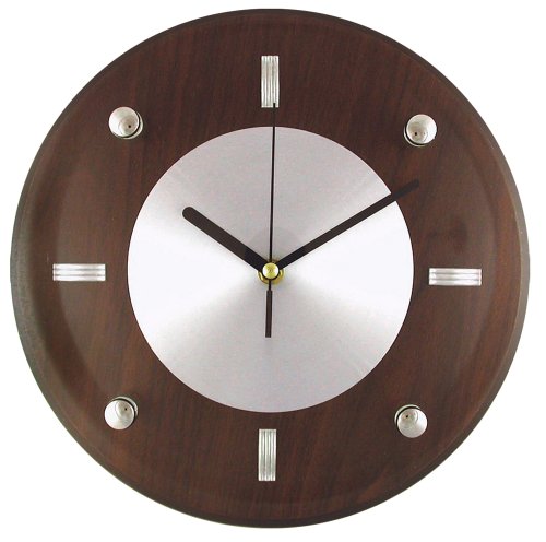 A great accent to any room. Stylish and contemporary 11" wood wall clock with brushed silver inner dial, raised glass cover with silver posts.