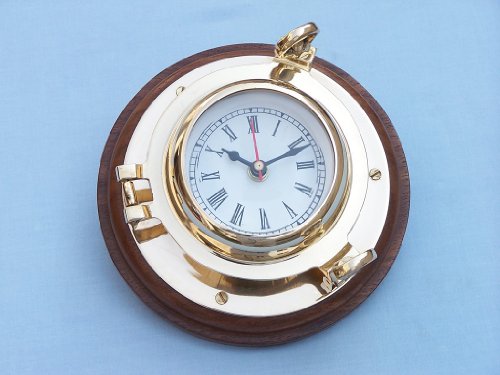 Made of polished solid brass on a dark-stained solid rosewood base, the Hampton Nautical Brass Porthole Clock is a classy and quality addition to any nautical themed room. Featuring Roman numerals with 15-minute intervals and a functional hinge and two twist screws, this porthole clock opens to reveal the mechanism and enable you to change the time or batteries. Solid Wood & Brass no plastic parts Polished Lacquer Finish for a shine without tarnish or fading Porthole Actually Opens change time without removing from wall Amazing Details, including: Accurate hinge and locks Authentic rivets Pre-Drilled Holes for easy mounting Custom Engraving Available with minimum quantity purchase Contact us for details