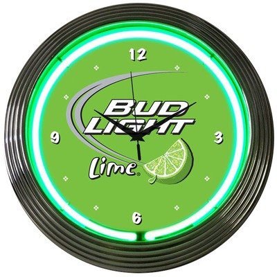 Bud Light Lime Clock Features: -Round clock features Bud Light Lime logo.-Lit with green neon lights.-4 Number dial.-Easily hangs on walls.-Takes 1 'AA' battery (battery not included). Includes: -12v AC adapter operates neon lights (included). Color/Finish: -Rim of clock has sleek chrome finish. Dimensions: -Dimensions: 14.5'' H x 14.5'' W x 3'' D. Warranty: -Exclusive one-year manufacturer warranty.
