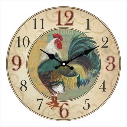 Pep up your kitchen decor in an instant with this vibrant rooster clock! Vintage-style illustration adds the timeless look of a farmhouse treasure, with a proud rooster at center stage and old fashioned numerals. Weight 1 lb. MDF wood. One AA battery not included. 13 1/4" diameter x 1 1/2" thick.
