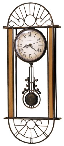 The Devahn Wall Clock by Howard Miller is a antique bronze-finished wrought-iron wall clock with oak-finished hardwood accents and coordinating pendulum.