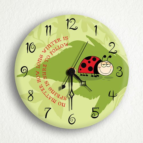 This is a cute wall clock featuring a cartoon image of a ladybug and the phrase, "No matter how long winter is, spring is sure to follow." It is approximately 6" in diameter. Requires one AA battery (not included). This would make a great gift or personal item for anyone who could use a little pick-me-up in their home or office.