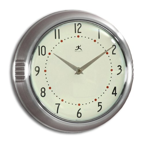 Red dots highlight each hour which enhances the cream-colored face. Black numbers and black hands are classic looking. The silver finished case is a perfect way to frame this retro-inspired wall clock.