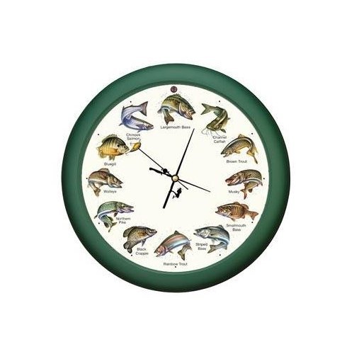 With millions of fishermen casting their lines worldwide, this will be the perfect clock to "mount" on walls in their man caves, cottages, basements or garages. Dial features twelve of the most popular freshwater gamefish in North America, beautifully illustrated by world-renowned outdoor artist, Jon Q. Wright. To add ambiance, each hour is announced by a variety of action fishing sounds. As an added bonus, packaging contains educational information on fish behavior and their natural habitats. Clock is perfect for wall or desk, using the built-in stand. A light sensor deactivates sounds when room is dark. 3 AA batteries, not included. 8 inch diameter.