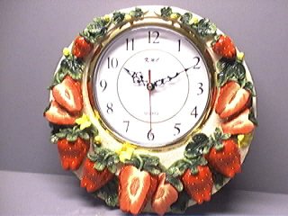 BRAND NEW 3-Dimensional Strawberry Wall Clock. This is really a beautiful clock with plenty of detail and vibrant colors. There are 3-D Strawberries on the clock which look absolutely gorgeous. The clock is made of a resin material so it is quite heavy and very sturdy. The Quartz clock uses one "AA" battery (not included). It measures approx. 12" in diameter.