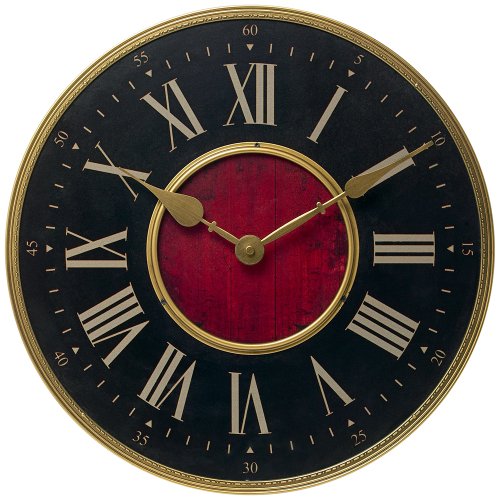 The Roman numerals, tick marks, and metal hands of this classic Italian-inspired wall clock are finished in antique brass. The black dial is surrounded by an antique brass finished bezel, and in the center is an antiqued wood-look scarlet circle. A versatile clock that will look great anywhere.