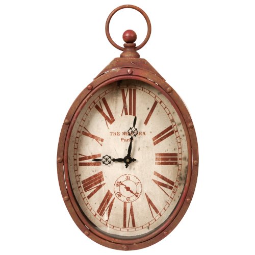 This unique wall clock has a distressed rust red metal frame with a tan face and large red roman numerals that can be seen if you mount it high. The design looks like an old fashion stop watch.