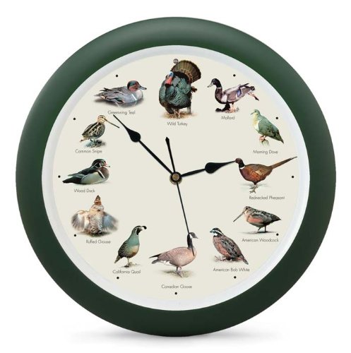 The Game Bird Sound Wall Clock features twelve of the most recognized Wild Game Birds in North America. The clock announces each hour with the distinct call of a different game bird. Live recordings provided by Cornell Laboratory of Ornithology. When the room is dark, a light sensor deactivates the sounds.