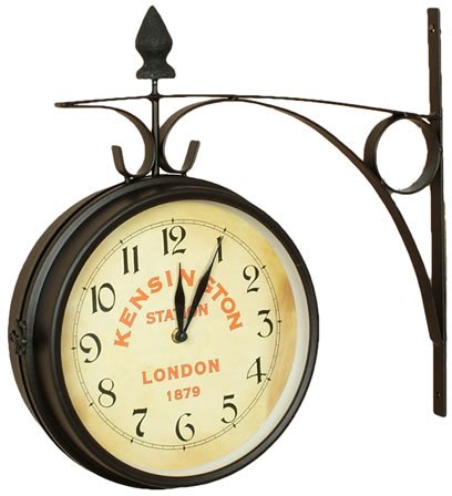 Old Kensington Station Clock. A classic interpretation of a clock that once hung at Kensington Station, its unique two-sided design lets you read the time at any angle. The clock includes a metal wall bracket and requires 2AA batteries. The hand forged metal hanger and casing in a fine black finish add to the old world charm and style of this clock. Finished off with an aged ivory face and glass cover.