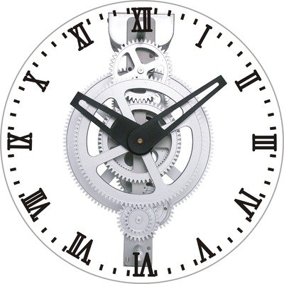 The mechanically inclined will love this exposed gear clock. It features a cluster of exposed moving gears set behind a clear glass face with easy to read black hands and Roman numerals.
