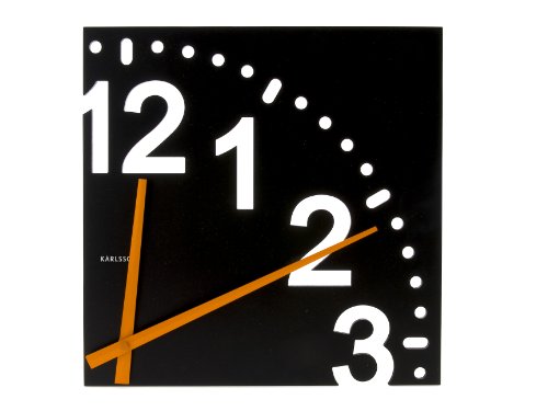 Decorate your home with this stylish asymmetrical wall clock. Black wooden face with contrasting orange hands. White numbers and second markers are carved into the the clock. Measures 12-inch diameter. Karlsson is a renowned Dutch clock brand and is one that’s synonymous with good quality, stunning graphics, aesthetic shapes and innovative design.