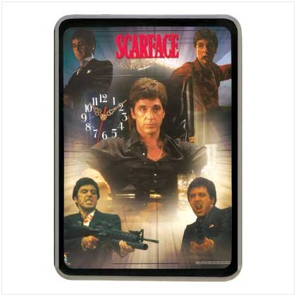 Al Pacino?s beloved gangster bursts into life on the face of a stunning decorator clock. Five full-color movie stills make this terrific timepiece a true must-have for any fan of the cinema classic! MDF wood. One AA battery not included. 15 1/2 inches x 1 1/2 inches x 21 1/2 inches high.