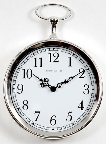 Classic pocket watches were the design inspiration for this wall clock. The cast resin case gets a bright silvertone finish. The dial is pure white with easy to read black numbers. The hands are also black with an antique shape
