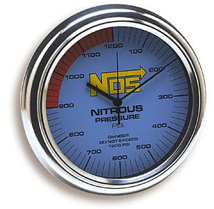 The NOS wall clock is patterned after Nitrous pressure gauge. This 10" clock has a 100-1200 display and sky blue face with silver ring. This wall clock requires one AA battery.