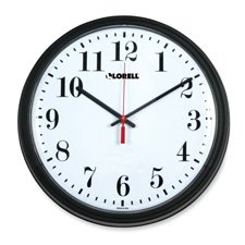 13-1/4" round wall clock features Quartz movement and a black frame. Easy-to-read white dial has Arabic numerals, black minute and hour hands, a red second hand, and ABS plastic cover. Wall clock runs on one AA battery (sold separately).