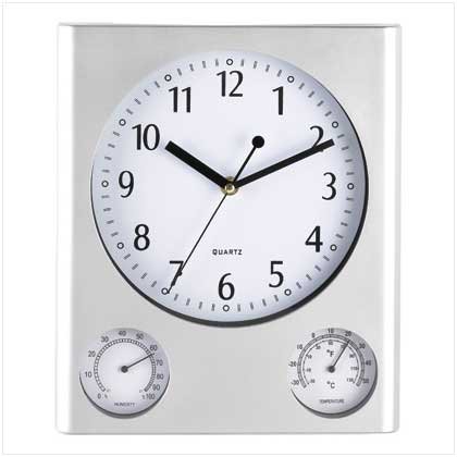Find out the temperature and time at a glance with this all-in-one weather station clock! Professional gauges display time, temperature and humidity, all housed in a handsome contemporary case. All in one wall clock with hydrometer and thermometer function. Quartz clock with hour, minute and sweep second hands. Thermometer with Celsius and Fahrenheit. Humidity meter to determine whether it is very dry, normal or humid. Plastic; quartz clock. One AA battery included. 10 inches x 1 inches x 111/2 inches high.
